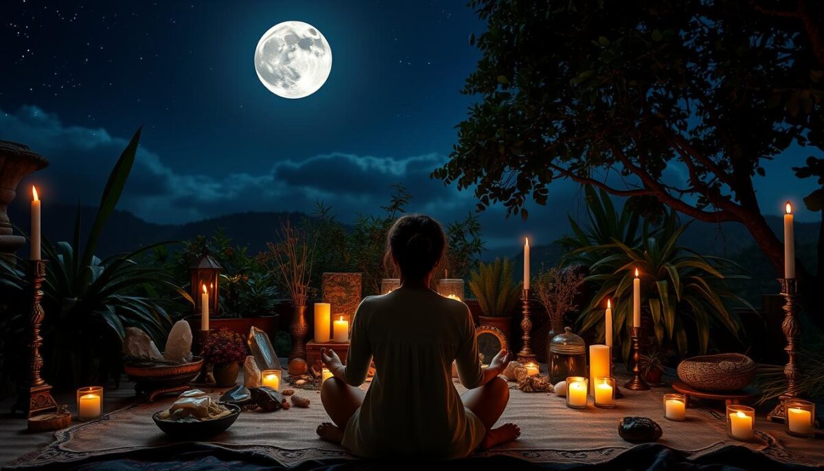 Para harmonizar a energia da Lua em Virgem, é essencial adotar rituais lua em virgem que promovam equilíbrio e organização. Meditação, yoga e reflexão diária são práticas que ajudam. Elas clarificam a mente e focam nas prioridades, melhorando a harmonização lua em virgem.