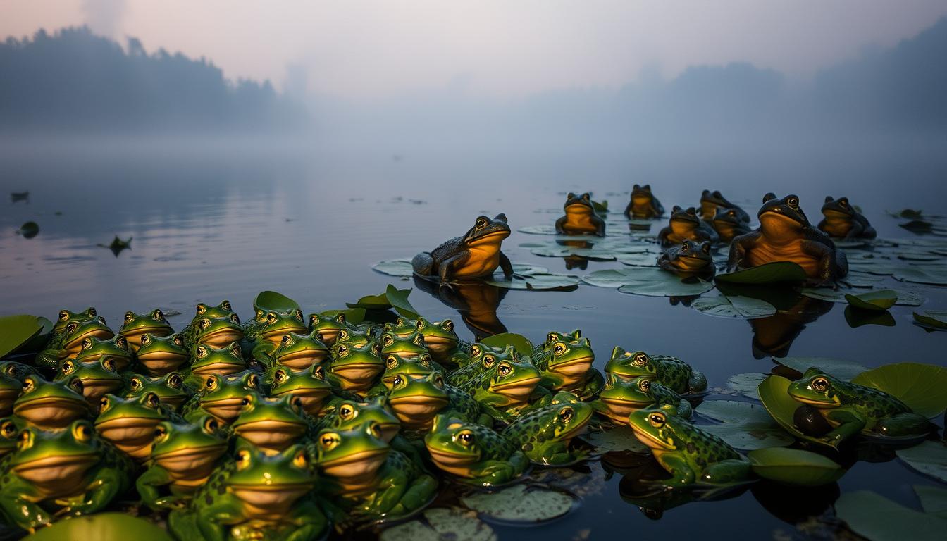 Quando sapos aparecem em grandes números em ambientes aquáticos, é um sinal de emoções descontroladas. A água em sonhos representa nossos sentimentos. Muitos sapos em água podem indicar uma intuição aguçada ou crises que estão para emergir.