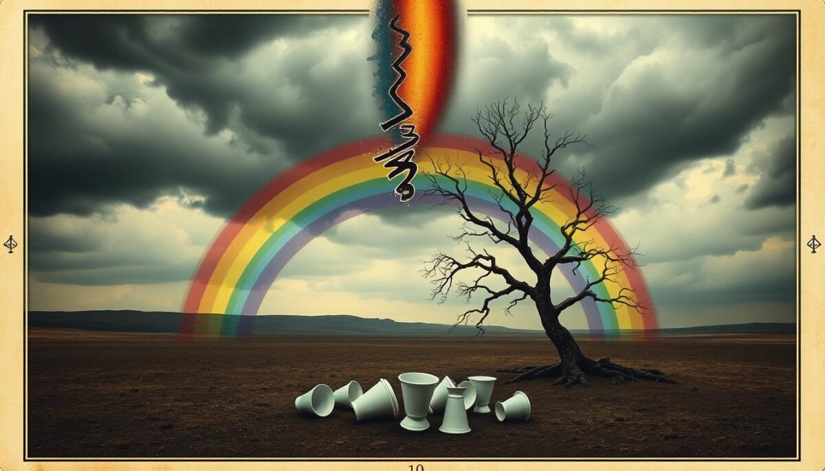 O simbolismo do 10 de copas toca diretamente nas emoções humanas. O arco-íris indica que superar dificuldades é possível com união e alegria. Assim, a carta se torna um símbolo de esperança e felicidade.