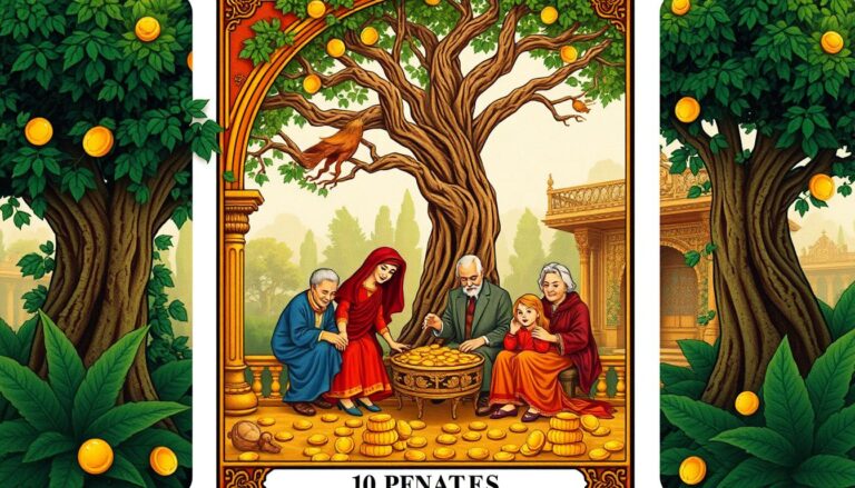 O 10 de Ouros é uma carta cheia de simbolismo. Ela está ligada a riqueza, legado e união familiar. Ao compararmos o Tarô com o baralho cigano, vemos que ambos dão insights valiosos. Eles nos ajudam a entender melhor a família e a herança.