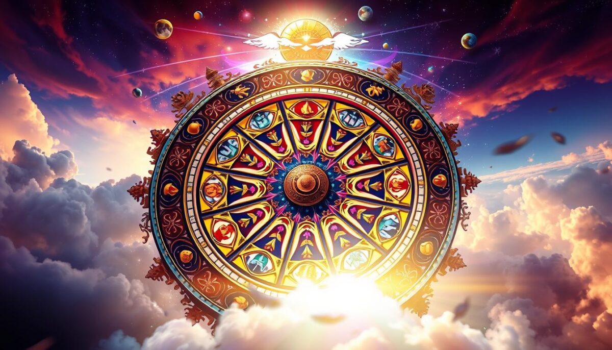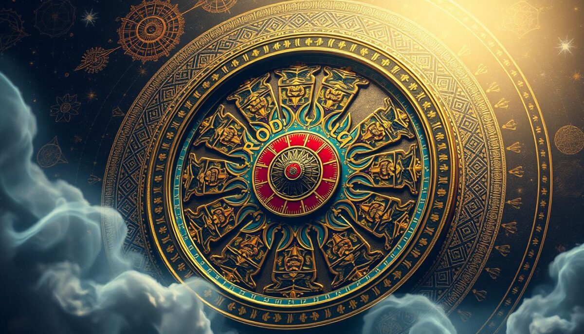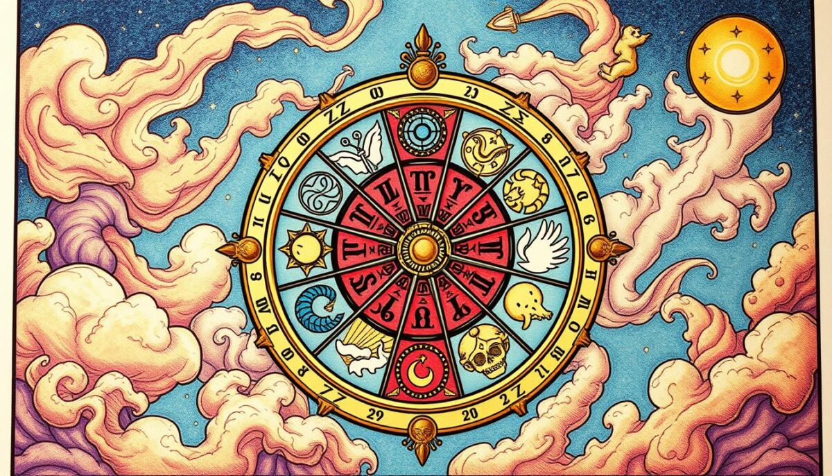 A simbologia da Roda da Fortuna no Tarot mostra os ciclos da vida. Ela fala sobre a mudança constante e a sorte imprevisível. Cada parte da Roda da Fortuna tem um significado profundo, nos fazendo pensar sobre a vida cíclica.