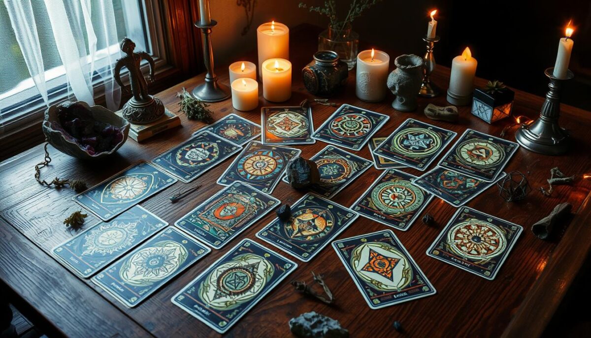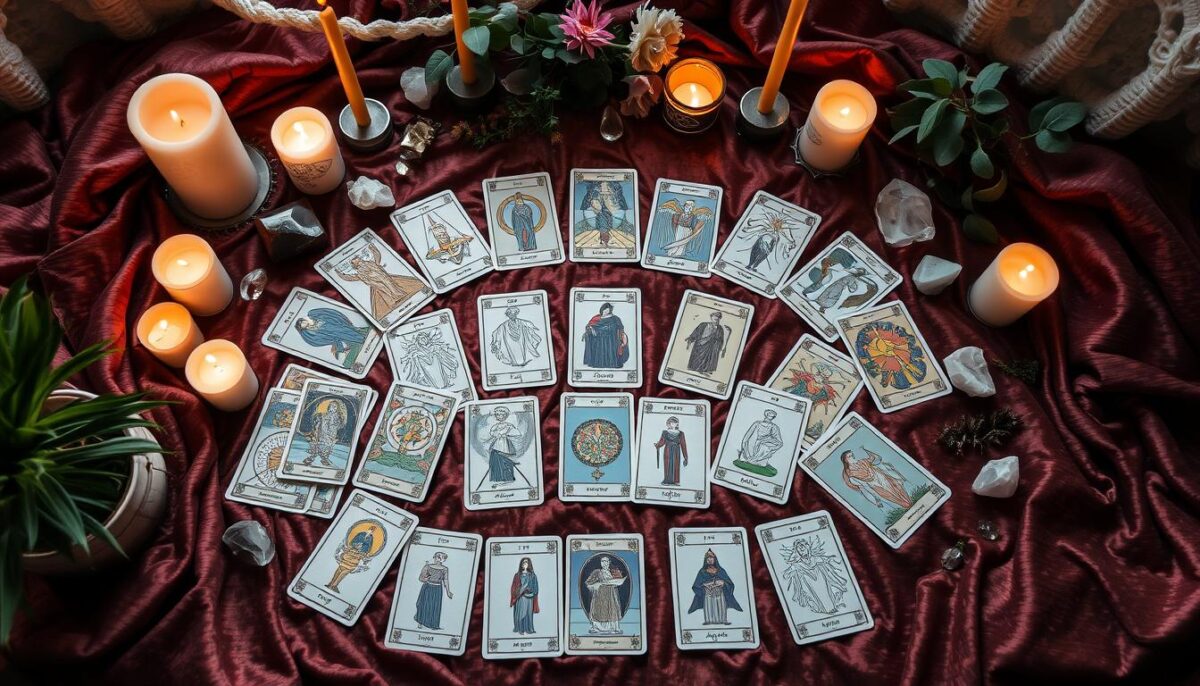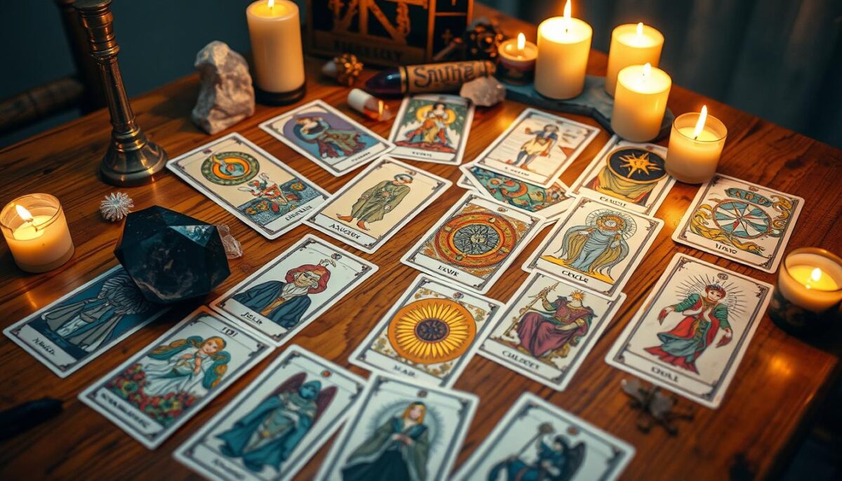 As cartas do tarot são ferramentas poderosas para autoconhecimento. Elas têm um simbolismo do tarot com várias camadas. Cada carta mostra um significado das cartas que muda conforme a situação do consulente. Entender bem essas cartas é crucial.