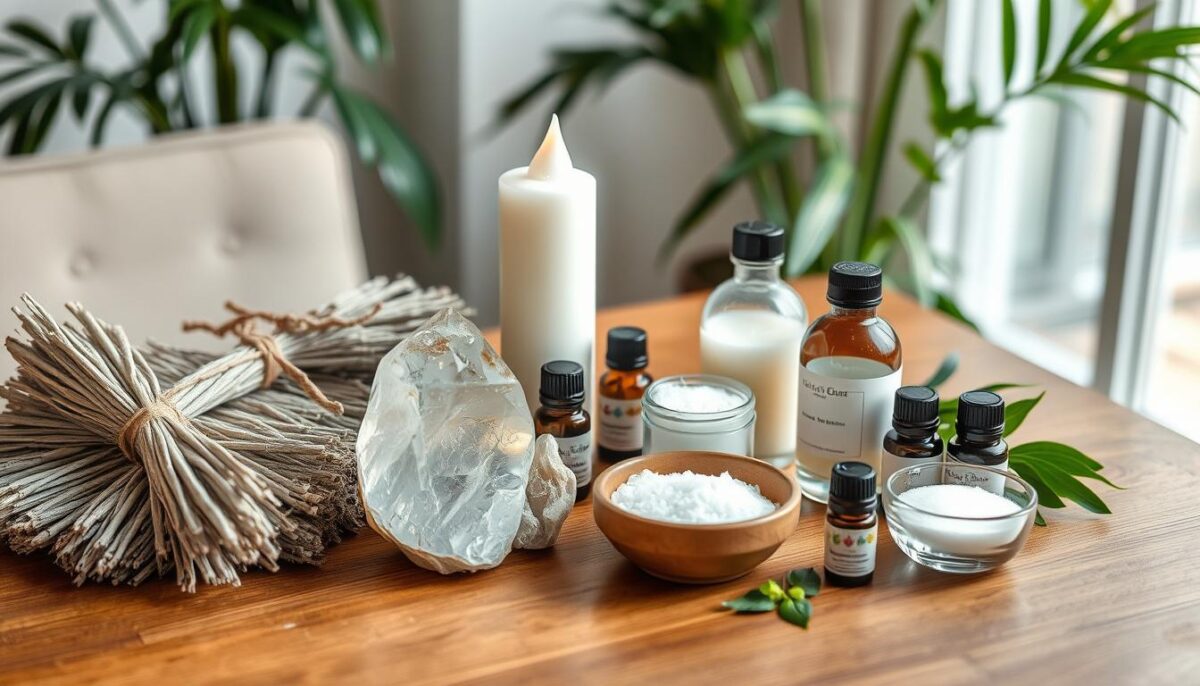 Materiais importantes incluem incensos, ervas como alecrim e sálvia, além de sal. Cristais como quartzo e ametista ajudam muito porque têm poderes energéticos.