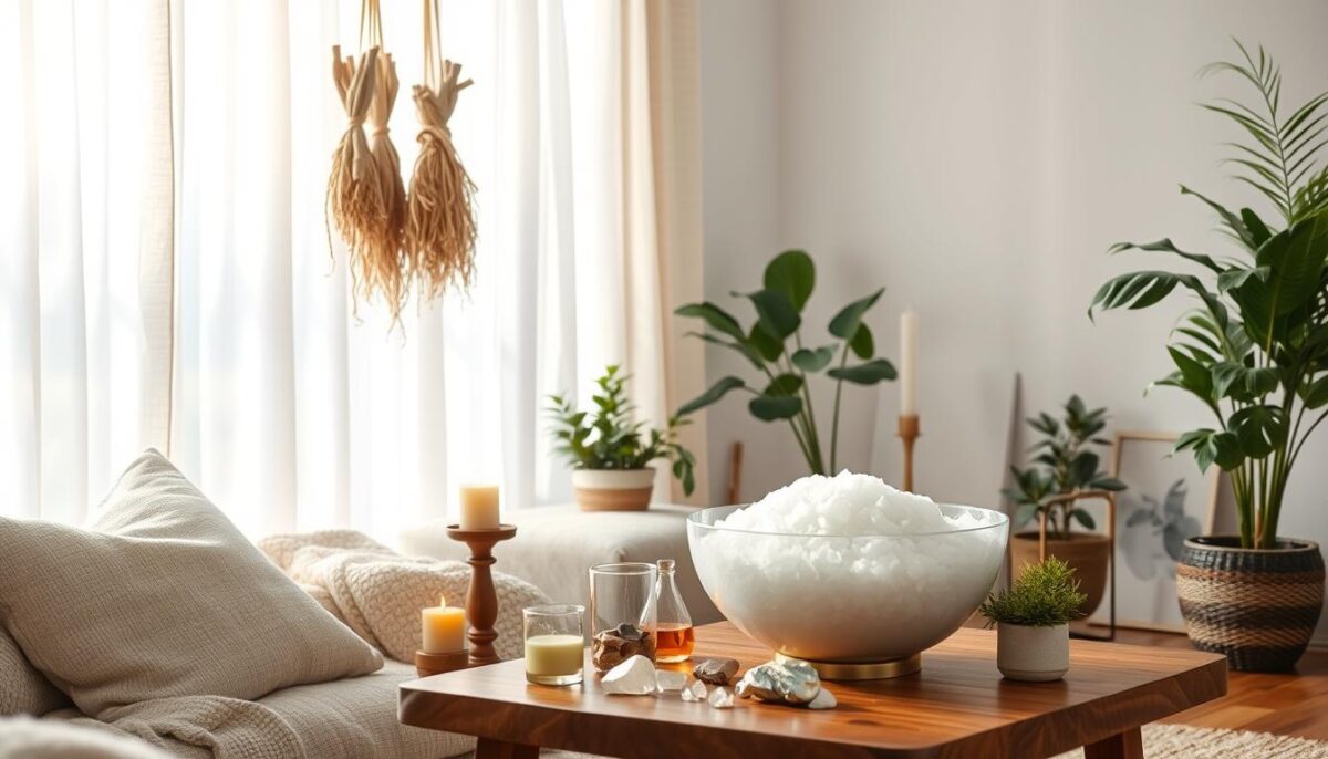 - Cristais: Quartzo e ametista elevam a vibração do espaço, transformando energias.