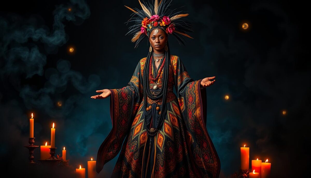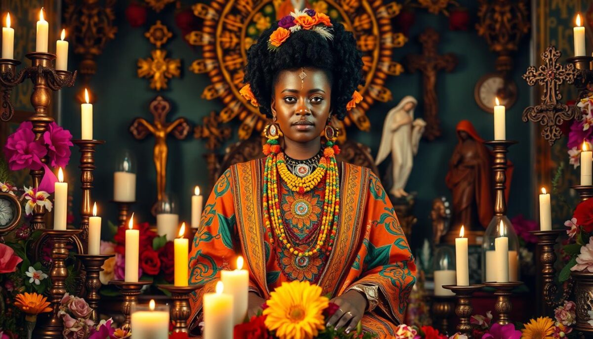 O sincretismo religioso é essencial para entender Dona Menina Pomba Gira. Ele mistura elementos africanos, indígenas e europeus. Isso cria uma figura única que une várias tradições religiosas.
