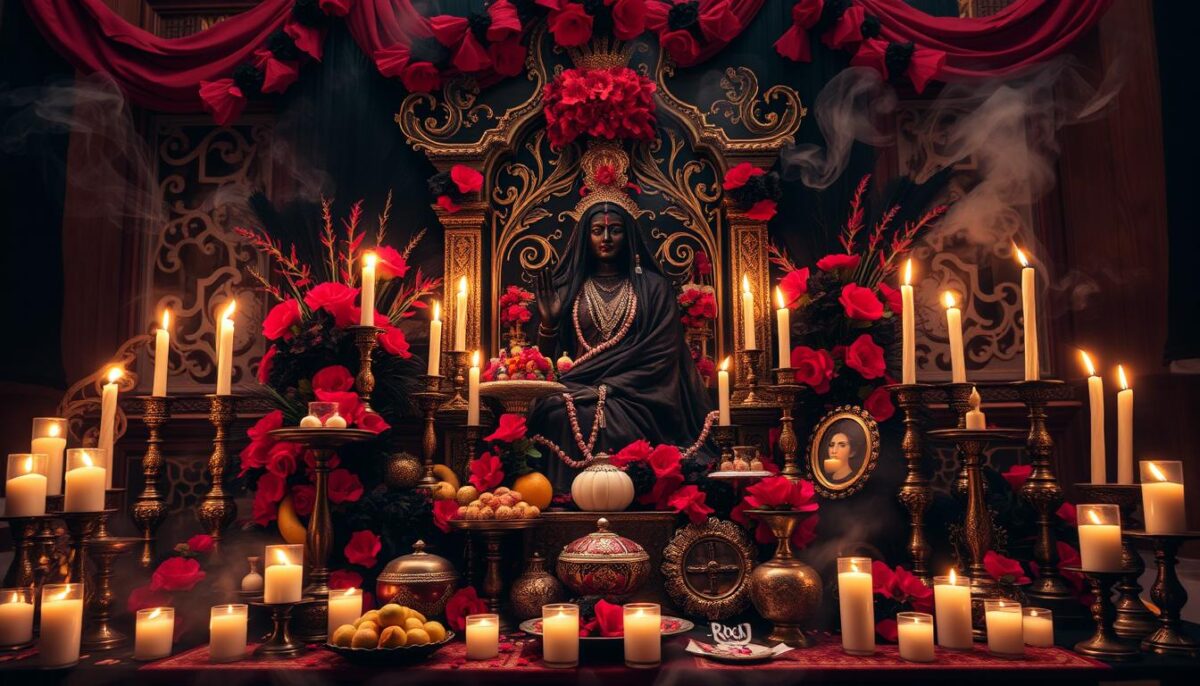 Os rituais incluem oferendas de flores, bebidas e doces. Práticas de proteção e amor também são comuns. Esses rituais são feitos com respeito e devoção.
