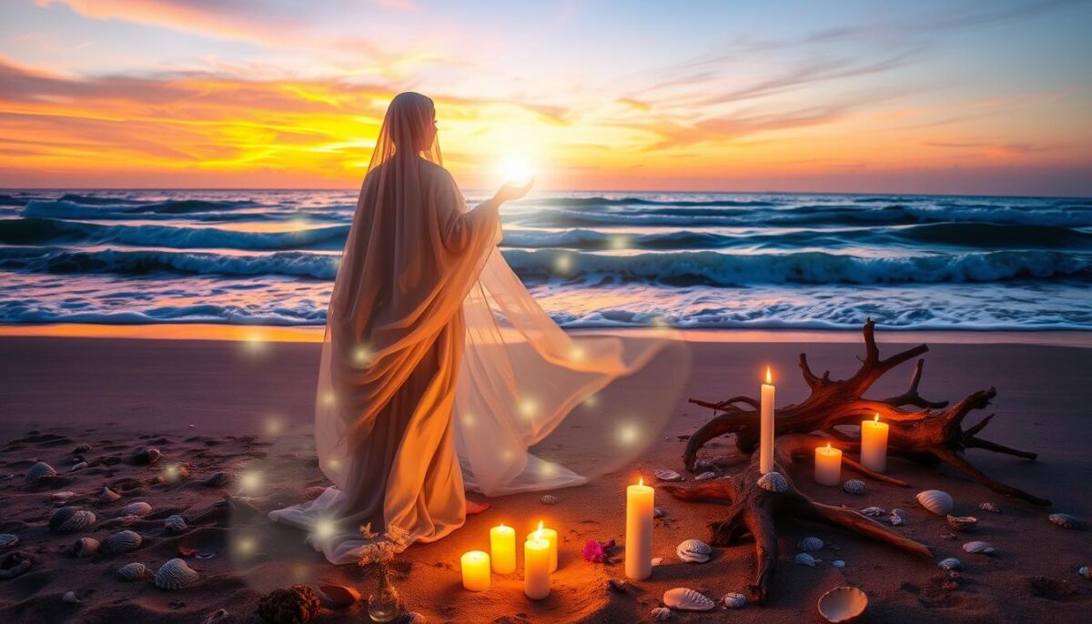 A conexão espiritual com a Menina da Praia é fortalecida pelas orações Menina da Praia. Elas são essenciais na vida dos devotos. Essas orações têm intenções específicas, como pedidos de amor e proteção contra energias negativas. Elas têm o poder das orações, ajudando a fortalecer a relação com essa entidade espiritual.