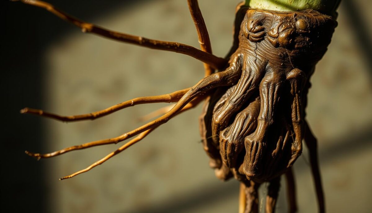 - Raiz: Grossa e nodosa, muitas vezes recordando formas anatômicas humanas;