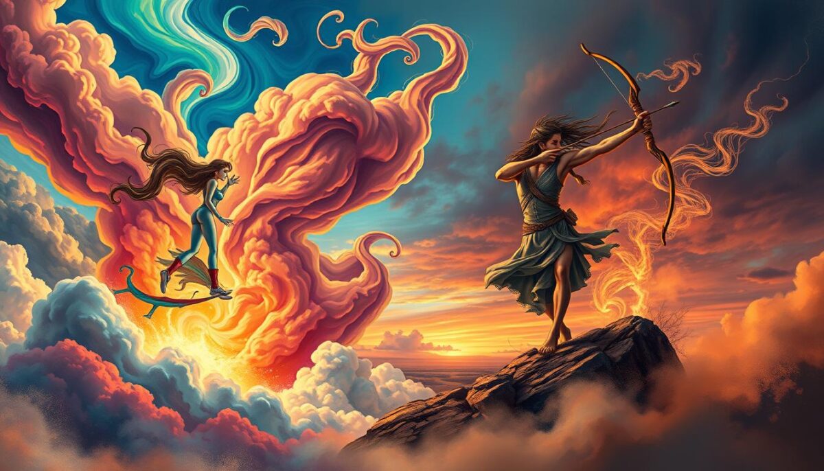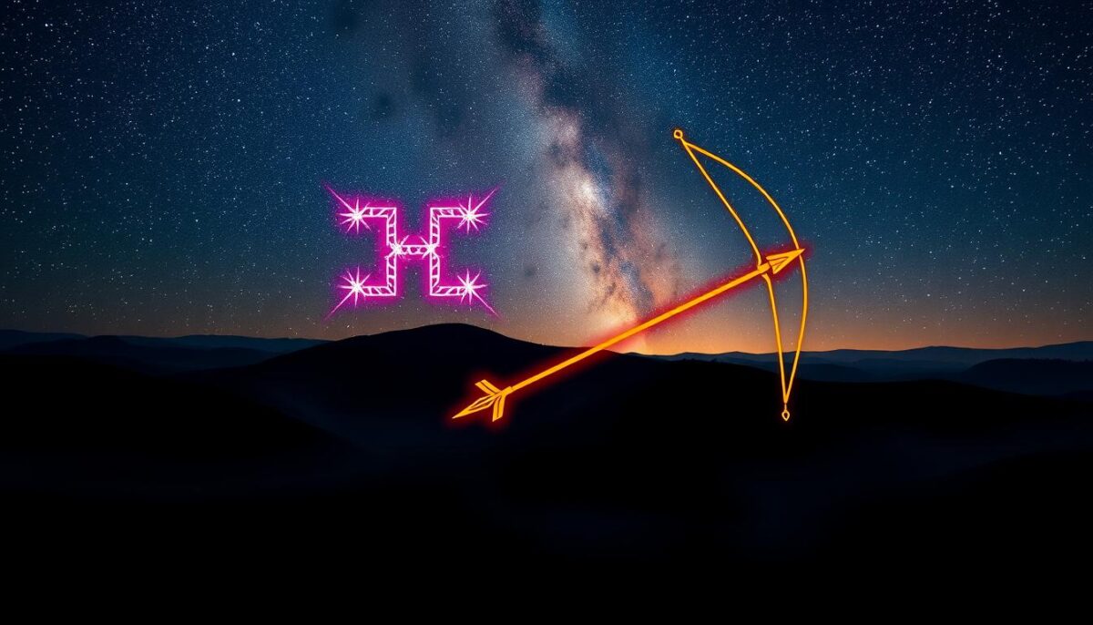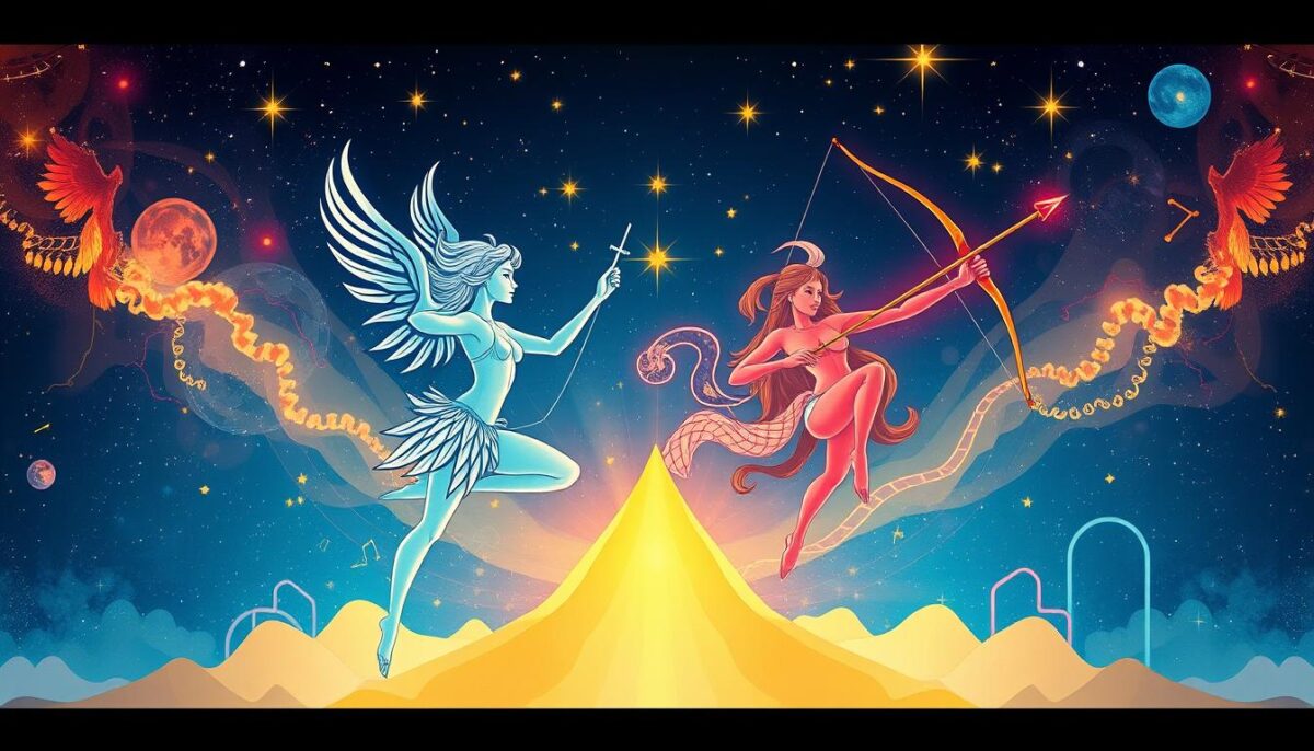 O signo Sagitário, oposto a Gêmeos, influencia muito a personalidade de quem é gêmeo. Esse impacto se vê em várias áreas da vida. Ele ajuda a entender melhor quem somos e a crescer pessoalmente. As influências astrológicas de Sagitário são chave para ver como ele complementa Gêmeos.