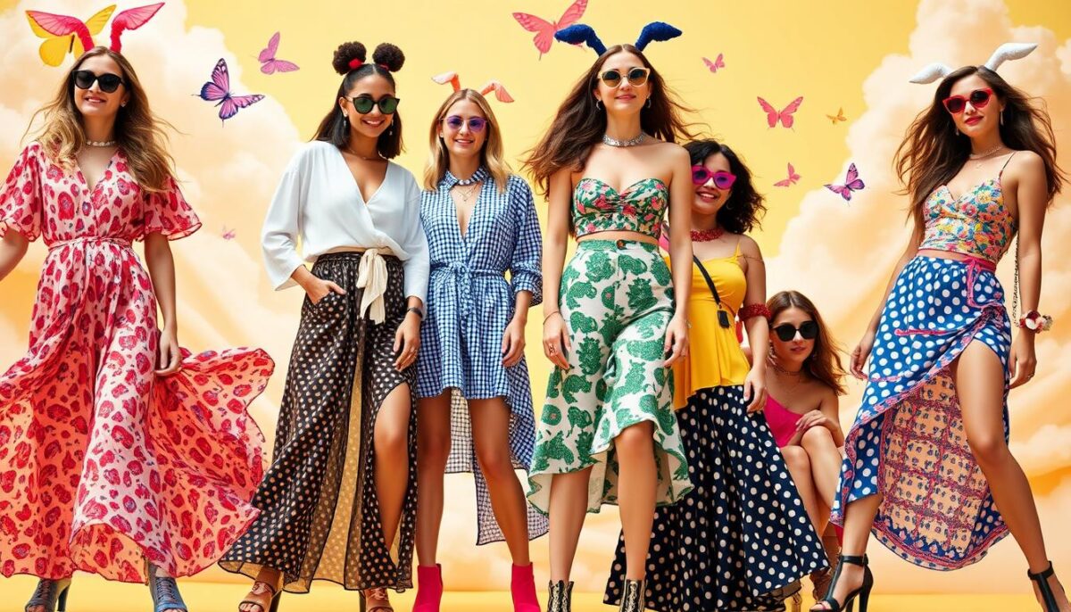 | Cores Vibrantes | Estampas gráficas e multicoloridas |