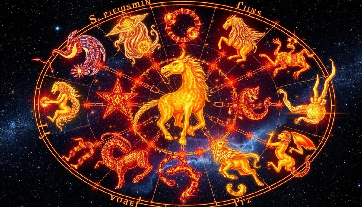 Os símbolos do zodíaco são essenciais na astrologia. Eles nos conectam ao universo. Vêm de civilizações antigas, mostrando constelações e ideias universais.