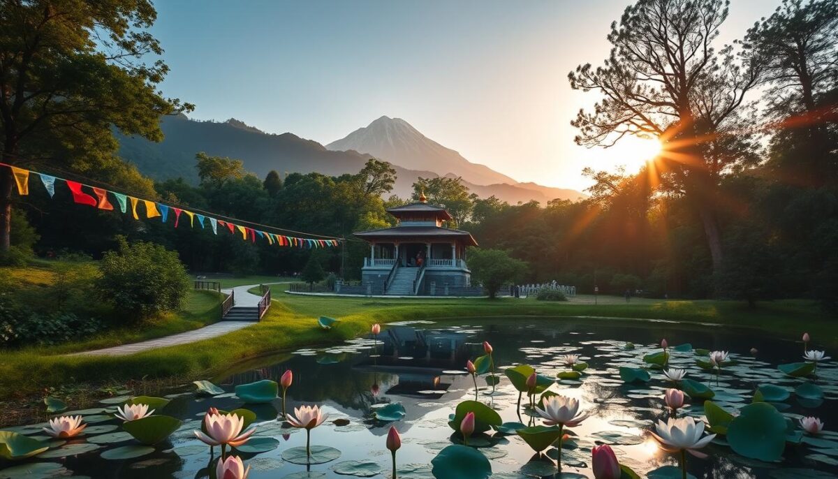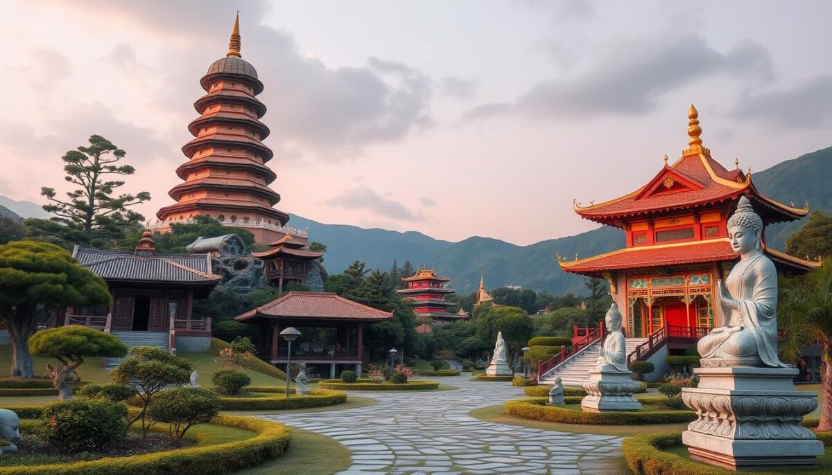 Os templos budistas são muito importantes na cultura budista. Eles não são apenas para orar e meditar. São também expressões da arquitetura budista, que mistura beleza e espiritualidade de forma única. Cada detalhe, como tetos altos e pisos decorados, mostra a compreensão do simbolismo religioso das tradições budistas.